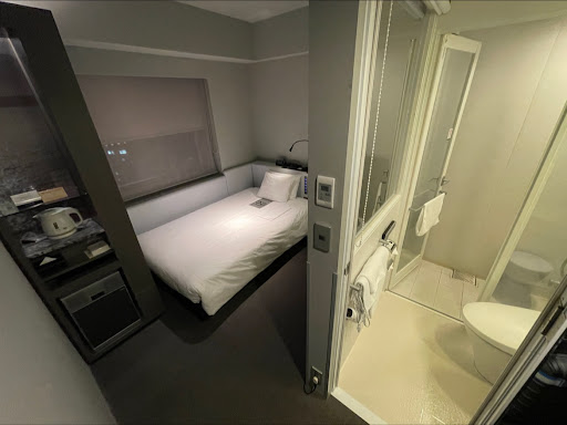 Shower pressure was fantastic and especially enjoyed the rain shower. Not a small unit bath as most business hotels have. The toilet is detached from the bathroom in a separate space just as it is in most Japanese homes and the space in the shower and tub area is therefore comparatively roomy. The hotel body soap smells quite nice too (didnt use their shampoo/conditioner so can't speak to that). Beds were comfortable, not too soft or too firm. Pillows were also good.