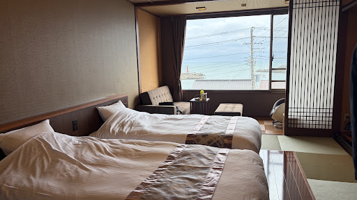 オーシャンビューは恐らくWebサイトからイメージするものと違っています。 ストリートビューなどで見てほしいのですが、海までの間に家が何軒かあり、旅館自体も凸凹した作りなので部屋によっては民家に加え旅館の建物も景色に入ってきます。 それと見える範囲は漁港がメインなので、必ず灯台や堤防が視界にあります。 散歩がてら海の目の前まで歩いて行っても、両端には陸地が突き出している地形のため、開けたオーシャンビューみたいのは見られません。 私は何もない海がバーっと広がっているのを期待していたので少し残念でした。