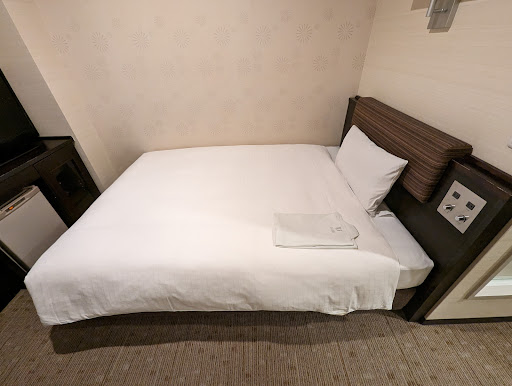 Stayed 4 nights in a semi-double room. Large hotel right inside train station so convenient for day trips. Lots of food options in the area, we particularly liked the restaurants in the FORUS shopping centre at the station. Most of the main sights can be reached by bus (bus station is at the train station) or on foot (around 20 minutes).||Front desk was fine but very little English spoken. Wifi and wired internet worked well.||There was an extra 200 yen/person tax which had to paid upon check-in. Room was very small, which is not unusual but when rooms are that small, it's important that they be as functional as possible (i.e. a small glass shelf in the bathroom or an extra hook to hang things would have helped maximize the small space). Towels were a bit on the threadbare side. ||We had this room at a good price but if I return to Kanazawa, I would not stay at this...