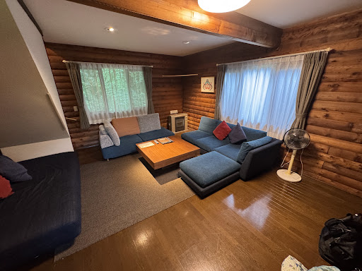 10 minutes from Karuizawa station by car, this small complex of log cabins is a relatively convenient place for a getaway break. The cabin I had was very clean, but the furnishings and decor were a bit old in style. The small kitchen had crockery and glasses, all of which were spotless. It also had a shower/ bath, two upstairs rooms, a TV, a patio with table and chairs etc. The location is far back from the main road, so very quiet, but you are still only 10 minutes walk away from a local lake\ sightseeing spot (Shiozawa Lake & Karuizawa Taliesin) and accompanying facilities. Bicycle rental services are available (although I found the prices to be expensive, even if just renting for 1 hour) , and a large super market and convenience store are also only 10 minutes away (cabin also had a fridge). Staff were very friendly, providing directions, bus timetables (very limited in number!) and sight seeing information (in Japanese). A tennis court is available, along with badminton equipment (also to rent). You can also book a barbecue or fondue, which is delivered to your cabin for you to cook (if you prefer, there is also a restaurant on the grounds, with excellent, if pricey, international cuisine). If you pay for breakfast, fresh bread and coffee is delivered to your door at a time of your choosing before checkout at 10.00am. I would definitely visit again! (Some services may be seasonal, so definitely check the site website for details...