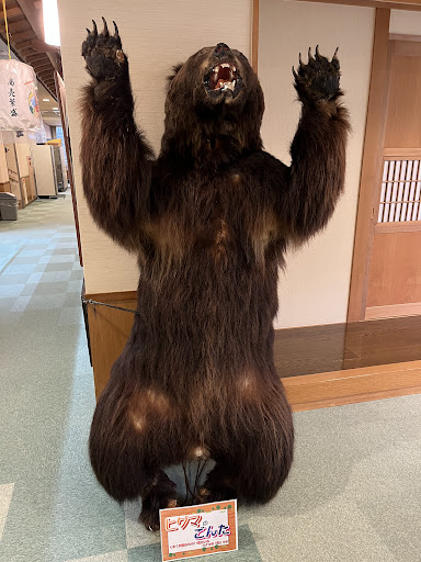 Read more冬の季節、運転に自信が無いので鷹巣から秋田縦貫内陸鉄道の急行列車でのんびりと行きました。||駅員さんアテンダントさんともに親切で一時間ちょっとの列車旅を楽しみました。||予め送迎を御願いしてありましたので直ぐに乗り換え数分で到着、雪が少なく周りに民家が見えたりしてあまり秘境感が無い。||チェックインして部屋の扉を開けて、ウッ、、、、喫煙だった、、、、||まあこんな時は窓を開けて換気しておけば風呂に入っている間に、オーケーとばかりに窓を開けようとしたのですが固着していて窓が開かない、、、、||風呂から上がって、食事の後に、部屋に入る度に、ウッ!、、、||もともと喫煙者で余り気にはならないのですが折角山の新鮮な空気との入れ替えも出来ずに残念でした。||熊鍋コースを頼みました、熊は猪の3倍くらい獣感が強くこれは癖が強いのでどなたにでもすすめる訳にはいかない、と思います。||しかも館内至る所に熊の敷き皮が置かれていて、ちょびっと罪悪感がありましたし。||温泉は大きな浴槽が二つ普通と熱い、空いていてとても気持ちよく入ることが出来ました。||マタギと云うと鉄砲担いで雪山を獲物を求めて歩く、てなイメージでしたが現代では多分四駆で行くなど簡単なのでしょうね、それで熊さんも道路を歩いて簡単に街に出られるようになってよく出て来るのでしょうか。||意外と秘境感は感...