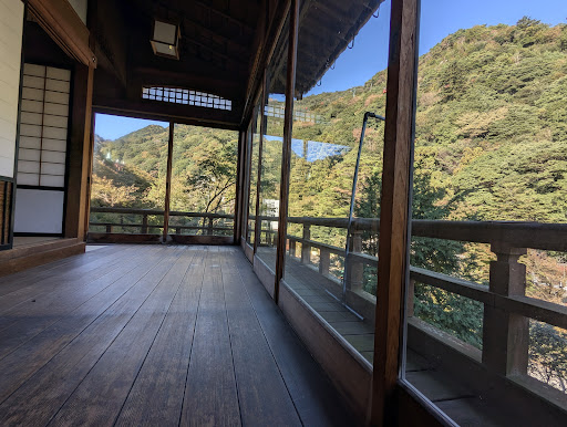 After checking out, we toured "Suiunkaku," the ryokan's old main building. We admired the curved Taisho-era glass and the luxurious use of rare woods.