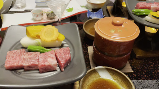 Dinner was served in our room, which was the main reason we chose this ryokan. The meal was generous and delicious. We also indulged in the "venison sashimi" spotted on a poster by the elevator, which was superb. Additionally, since it was my birthday, my wife had arranged for a surprise dessert birthday plate, which was thoughtfully prepared by the staff.