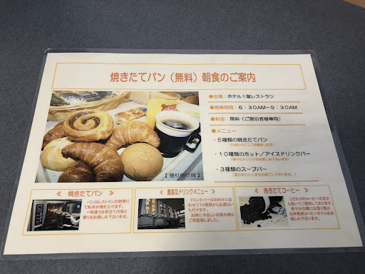 無料の朝食はホテルで焼いているパンが食べ放題。デニッシュが多いけど5〜6種類どれも焼きたてなのでサクサクで美味しいです。食べる時間がなかったら、パンを焼いている人にテイクアウトできるか聞いてもらえればポリ袋を貰えると思います。