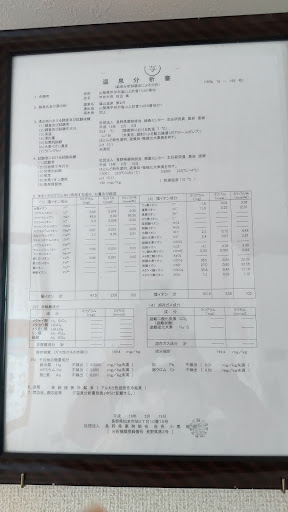 【温泉基本情報】 泉質:単純硫黄泉(低張性・アルカリ性・冷鉱泉) 泉温:23.8℃ pH:10.1 溶存物質:169.4mg/kg 湧出方法:動力揚湯 [大浴槽] 加温:あり 加水:なし 循環:あり 消毒:あり [水風呂] 加温:なし 加水:なし 循環:なし 消毒:なし?