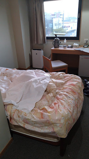 部屋は風呂がないこと以外は普通のビジネスホテルで、トイレ、冷蔵庫、テレビ、Wifiなどはあります。ベッドの下に予備のベッドがあり、そのベッド分の床面積があるので広さは十分です。仕事での利用もしやすいと思います。
