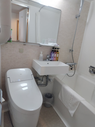 次にアメニティですが、基本的にはお風呂場はよくあるトイレと同室のユニットバスですが、使い捨てのボディタオルだけでなく、入浴剤も1つではありますが、置いてありました。今まで私もいくつかのホテルに泊まったことはありますが(1部屋1万円を超えるような高いホテルや旅館は無いけれど)、ここまで置いてあるのは初めてでした。トイレもたぶん最新型に近いモデルだと思います。詳しくないので知りませんが。