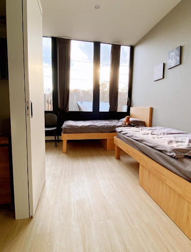If you have a bit of luggage, it can feel a bit cramped, but cleverly you can slide your rolling luggage under the bedframes. There's plenty of hanging storage which is really useful for skiing, and there's a fridge in your room which is handy to keep some Strong Zeros. The heating in the room is excellent, you have a large head unit in your room and control over the temperature. There's even a boost button that gives you a few minutes of extra warmth if you need it.