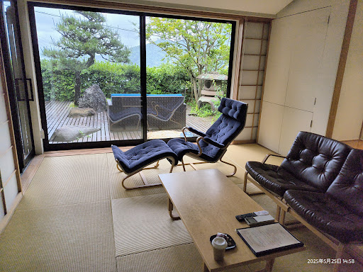 Read more京都夕日ヶ浦温泉でオーシャンビューの露天風呂付き客室の宿を検索して 夕日ヶ浦海岸からは少し離れていますが、濁り湯にまずひかれてと、少し離れた静かな感じにひかれてこちらに決めました。 お部屋シンプルで綺麗です上品な感じがするお部屋でした。じぞうに宿泊しました 思っていたよりは広くはなかったですが、綺麗なお部屋でした。お風呂も檜内風呂、石造りの露天風呂ありお湯が良かったです。濁りにほのかな海の香りのする塩化系の温泉湯上がりスルッとします。お庭もソファーあり湯上がりに良かったです。海の潮騒と鳥の声に、とても癒やされます。 見晴らしもかなり良いです。 大浴場もシンプルですが濁り湯とサウナもあり綺麗で良かったです。 お部屋にはコーヒーお茶ありますがコーヒーが数多くおいてあり気兼ねなく飲めるのが嬉しかったです。ロビーにも湯上がりにコーヒー、ドリンク、ワイン、ウォーターサーバーなどもあり、ありがたいサービスでしたがお部屋に持って行くはできませんが湯上がりに最高でした。お食事については料理は見た目、繊細ながらに美味しい味かなり良かったです。季節に合う素材に見た目、味付け個室でのお食事で料理は大変満足しました。 中居さんや対応も優しくく丁寧です。 こちらのお宿は静かな、おこもり宿にうってつけです。食事以外は誰もいないのか?自分達だけと思わせるほど、ほどよい音楽と、あちこちから波の音いい意味での静けさに本当にのんびり出来ます。 自然感じながらの、のんびりと温泉重視で最高です。夕日ヶ浦温泉より温泉質はいいです。 立地は観光なら、こちらから車で15分ほどで夕日ヶ浦海岸や道の駅なども行けアクセスもいいです。 車で15分ほどの木下酒造も中居さんに教えてもらい行きました地酒や酒ケーキ、酒ソフトクリーム美味しかったです。 最高なお宿ですが星3つになった要素は全国色々なお宿行った個人的総合での評価になります。値段が5、6万円代なら最高評価でした。 お値段が9万となりますと色々行った結果の感想として部屋の広さ化粧品アメニティ、設備などは 色々行っただけに 少し物足りなさはあります。お風呂、食事、サービス、お部屋いいお宿です。 値段に対しては、それなりなお宿という感想になります。 ちなみに喫煙者の方は、ご注意下さい部屋は当たり前に、どこも禁煙ありますが、こちらは宿外などにも喫煙所はありません。 夏のお食事と庭での温...