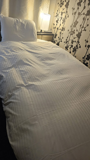 Read moreThe location was superb. I'm glad I didn't order breakfast. Seattle's Best in lobby has al a carte items plus you are surrounded by Family Mart, Lawson, 7-11 (next door), and a McDonald's around the corner. An overwhelming number of food options are available at Kyoto Station and Yodabashi. 3 min walk to Kyoto Station buses, a few min more through the station to subway, JR train, Shinkasen. ||||I was alone in what was hard to believe was a double (but it had two robes, two slippers, double bed) for 5 nights. Pillows are flat as described by others. There is almost no room to store your things and you'd struggle to access more than one suitcase or one suitcase larger than a carry on. No shelves, only two hooks and 4 hangers. There is a small desk but it is useless for sitting at as it is cluttered with ads and gadgets-- kettle, humidifier, tissue box, fabric refresher (some of which could be wall mounted). You will need the desk to store stuff. An air filter occupies additional limited floor space. Bathroom is tiny like a cruise ship but with good water pressure. There is a fridge but you have to turn it on when you want to use it and it makes a humming noise right by your head. The TV is absurdly large, as wide as the double bed. I was on a high floor but there was still lots of street noise.||||All of this was manageable for a few nights, however, until one or two guys moved into the room next door. I could easily hear voices at a normal speaking level through the wall and woke up at 4am to what I thought was an earthquake (the sound of a door knocking lightly) but later realized was someone having sex next door. Again, they were not being particularly loud but the walls are thin. ||||AC works but you cannot change the temp from 25C. Wifi was good.||||Room was ok cleanliness. Lots of dust around fridge, on...