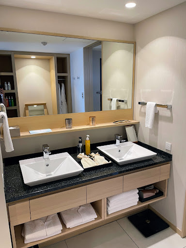 This is a newer hotel in Kyoto that is well-located, well-managed and definitely a great choice for our first visit to Kyoto. We booked the western suite, which is located on the top floor (9th) in the corner with a stunning view of the city, the river and the mountains in the distance. Electric curtains open to reveal the view each morning. What a lovely way to begin the day! The suite itself is enormous, with a large walk-in closet, entry vestibule, separate toilet closet, and then a spacious bathroom with sauna, dressing area, separate shower / bath area and dual sink vanity.