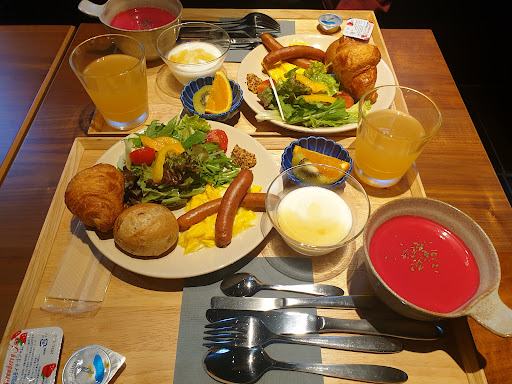 The hotel also offers breakfast for ¥2,200 per person. It’s not included in the room rate, and you need to reserve it by 8:00 p.m. the night before. Breakfast included a main dish (like a panini or soup with bread), yogurt with homemade granola, a fruit drink, and access to a mini buffet with salad, scrambled eggs, sausages, baked goods, and drinks. It was a good way to start the day.