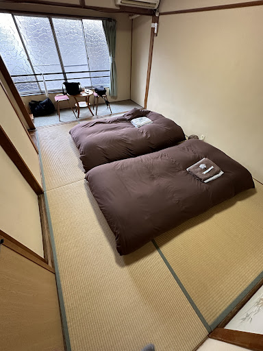 The Room: spacious, traditional Japanese experience, clean. The futon was so comfortable I would have loved to sleep in some more in it; but I did have to get out there and see the sites. That was arranged in one half of the room. The other half had a table with two chairs to sit, and an open area. There was plenty of space to put your luggage, and not feel cramped whatsoever- good value in comparison to other lodgings in Kyoto where things are a bit more of a squeeze. There were also maybe 3-4 other rooms on my floor, and sliding the door shut was good enough to muffle the noise and ensure privacy and a good night's sleep.