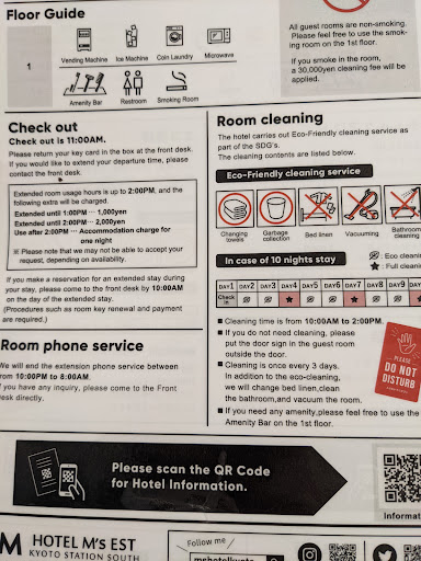 Ā Ā Ā Read moreThe double room size is very small for its price. We went inside our room with our check in luggages taking space all of our walking area towards the bed so we had to hurdle our way every single time. The bathroom area is very small as well and we cannot even open the bathroom door fully as remember, we had our check in luggages lined up there in the floor. Internet router is set up wrongly so we had to have it fixed š. No free water daily so we had to self service get it ourselves on the 1st floor although they provide it for free. When we go towards the hallway of the floor we booked, it smells so bad and for a hotel chain like Hotel M, it was such a disappointment. They don't clean it everyday either and when we left our towels outside, the expectation was to replace it with new ones but guess what, they didn't. Note that we have tried a number of hotels during our trip and even Hotel M itself before so we know what we are are getting into with what we booked and with our travels, we know we should be getting a much better experience with this one. We got this one due to the location but funny typing this one cause there are a ton of other options near Kyoto station as well.