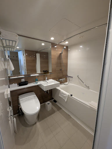 Read moreHotel was situated in a very convenient and safe location. We could easily catch busses or walk to the areas in Kyoto we wanted to visit. It was also located near the canal/river, which offered a lovely walk. The double room was spacious for Japanese standards with a small seating area, a small table, and a chair. The room was equipped with hangers for coats, hot water maker, tea pot, mini fridge, glasses, hair dryer, robes, slippers, and some toiletries like toothbrush and cotton swabs. The shower comes equipped with a large bottle of hand/face soap, shower gel, shampoo, and conditioner, which I love since it's so much more environmentally friendly than offering tiny bottles of everything with a high surface-to-volume ratio. The staff members were very friendly and helpful. Breakfast is available from about 6:30 to 9:00 and includes coffee, tea, orange juice, and pastries. The coffee machine does issue espressos, which were good, although there are no milk alternatives. The pastries are not vegan or gluten free, so plan accordingly if you have either of those dietary restrictions. Washer and dryer are available to wash your clothes. People in Japan seem to be very honest, but the equipment is set up to enter a code so only those with the code can open the machine, so you don't have to worry about sitting in the laundry room while your clothes wash to make sure they...