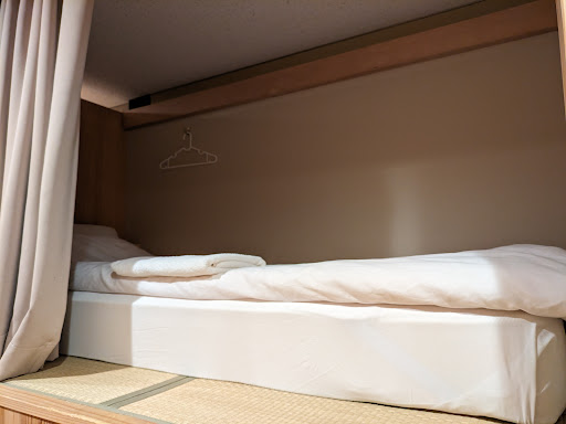 Pros: clean and spacious capsules. Comfortable bed. 5 shower stalls and toilets. Toiletries available (qtips, cotton pad, hair brush). Hair dryer, hair curler/straightener, towels, shampoo, conditioner, body wash, face cleanser, face essence, & hangers available. Convenient stores, restaurants, and shopping nearby (10 minute walk). Close to the city but not noisy at all. Near subway stations. AC is good. Stores luggage before check-in. Washer (300 yen) and detergent available.