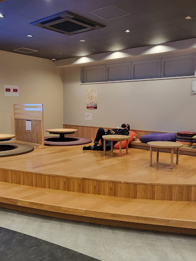 In the lounge area, where I mentioned that there’s vending machines, there’s also a microwave, a kettle, chopsticks, a water jug and trash bins. In the vending machines, you can buy anything from drinks, to cup noodles, to surgical masks, to pantyhoses. Also at most tables in the lounge, there are USB-plugs, so you can charge your stuff, while you relax. There’s also a TV, although it’s on mute.