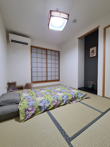 You also have: 1) en suite bathroom with deep tub-shower (a private onsen!), bidet-equipped toilet (heated seat in cold season), and vegan foam-soap, shampoo & conditioner; 2) amply shelved cabinet-closet to hide luggage & stuff for a tidy Zen room; 3) remote-controlled AC/heater, 4 electric outlets, 3 lights (main one has 3 brightness levels). Downstairs the dining area is also a tea room/ mini-library/ entertainment space. Next to the stairwell is a cozy cushioned nook with window. A clothes-washer is available. Everything in the rooms and common areas feels very new, pristine and immaculate.