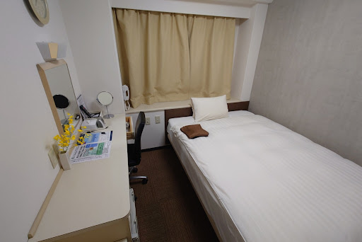 I visited Matsuyama with my wife and a female Japanese friend, so we required double and single rooms. We weren't not too demanding, as we only had one night in Matsuyama so we only needed somewhere to rest our heads after sightseeing around town.||||The single room our friend was given was perhaps the smallest room we'd ever seen - barely a step-up from a capsule. Literally, the room had a single bed with a tiny amount of space on the floor for luggage, with the toilet and shower opening directly off the room (ie. there wasn't a separate 'bathroom' as such). There was no window - it was as if they'd converted a broom cupboard into a single room. We all had a laugh when we saw it, and were thankful that we hadn't committed to more than one night.||||Our double was barely that much larger, and was quite a squeeze with 2 people and all our luggage. At least our bathroom was separate.||||The room sizes weren't a problem in themselves, but as the rooms were about the same price or more as a Toyoko Inn, without breakfast and TV (300yen extra for TV), we thought it was a bit of a rip. t was also quite noisy late at night. On the plus side, the hotel had onsens for men and women, and the location was quite good, being in the heart of the entertainment district and walking distance to the castle (but not Dogo Onsen, which was a brief tram ride away). It was also reasonably clean.||||Overall, this was just an average business hotel with miniscule rooms and offering poor value. Look elsewhere.||||As for Matsuyama, we really enjoyed our stay there - the castle and its views were spectacular, while Dogo Onsen was a great experience. We heartily...