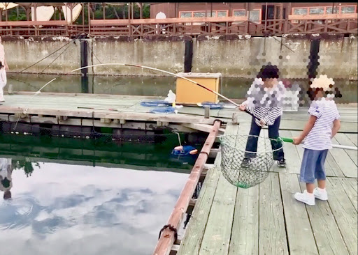 ファミリーコース用のイカダのイケスは2つあり、どっちで釣ってもOKです。7月中旬朝10時曇りで、入れ食いでした。針が隠れるように餌をつけ、深いところにスーっと落とすと30cmくらいのタイが食いついて来ます。このサイズだとそこそこ引くので楽しいです。 サクッと30分で5匹釣りました。この内、小学2年生の娘は3匹釣り上げました。暴れるタイを前に驚きつつ興味津々で楽しそうでした。