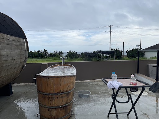 温泉も各ヴィラに専用の貸し切り風呂が有って、洗い場が4つ付いていたので、大人4、5人でもゆったり入れました。 又、宿泊しヴィラにはバレルサウナとジャグジーついていたので、早朝に海を眺めながら、両方堪能しました。