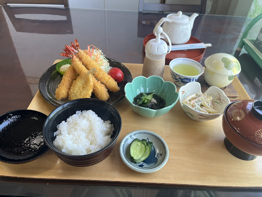 Read moreお昼ごはんを探しながら運転 道に迷って漁港に入ってしまった。折角知多半島に来たのだから美味しいご飯にありつきたい思い一心。 と言っても腹ペコには勝てず、古びた鉄筋のホテルに食堂があったので飛び込み。 玄関横には屋上にはスカイレストランとの古びた看板が目に飛び込む。 うーん入ろうか迷う 腹ペコの勝ち イン やはり年期の入ったホテル ガイドさんらしき人が一人御食事 上の方からはカラオケ? 賑やかな声 流石民宿ホテル 席に案内されメニュー 漁港の中のホテルだけあって海鮮が多い お勧めを聞くと好みだからとお婆ちゃん 悩む ツレは天丼 私は刺身定食 板前さんが生け簀からピチピチ跳ねた魚を網で掬ってる、あれが私のランチか!⤴️ 暫くして 配膳 これはうまそうだ 本日はカサゴの刺身 捕れとれである。 活き造りのためまだピクピクしている板さん凄い 実食 刺身プリプリ ここは当たりのお店間違いなし。 価格もお値打ち 本当にうまい ご飯も味噌汁も上手い 天丼も海老プリプリだとか ここはまた...