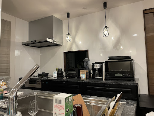 せっかくステキな家電や食器があるので、1日目の夜はVillaでお料理(サラダ、しゃぶしゃぶ、チャンプルーなど)を作って食べました。 自分の家でお料理をしているくらい、いろんなキッチン用品がそろっていて(家電は自宅よりも良いものばかりでした!笑)、カセットコンロもあり、鍋もフライパンもサイズが多様だったので、大人数の料理作りにも助かりました。 炊飯器も、バルミューダのトースターもあったので、朝ごはんは、パンもご飯も食べれて良かったです!コーヒーマシンと豆もあったので、美味しいコーヒーも一緒に飲めて、良い朝を過ごせました!