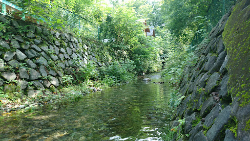 設営が終わると汗だくで場内の小川で一涼み。 階段で降りるともうひんやりで、あっという間に汗が引きました♪ 子どもたちはザブザブ入って遊んでました。
