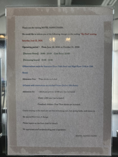 What makes point 1 even worse is that even if I want to spend the 3000 yen to try the roof top pool, the pool isn't open as supposed at 10am, and when I asked the concierge at 1/F, the reception just answered matter of factly that due to approaching typhoon, the roof top pool will be close for the day, but there wasn't any mentioned of that anywhere! Not posted at concierge, not posted in lift, not posted at lift lobby, I waited the pool to open, only to know that it's been closed due to weather without any notification, and wasted me 2 hours sitting at hotel room after waking at 8am.