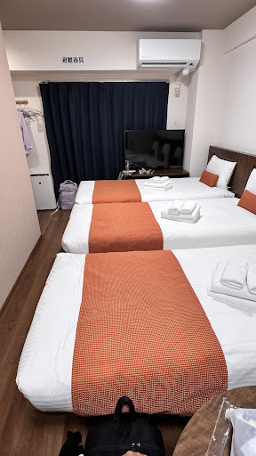 Read more✦ 中文 • 飯店位於國際通浮島街,步行 1 分鐘到 Lawson,轉角即主街。 • 無專屬停車場,一樓兩格為月租。左右兩側皆有收費停車場,18:00 後較易有位;若客滿可用租車公司導航找其他停車場。 • Lobby 服務時間 14:00–20:00。Check-out 時將鑰匙投入大門右側信箱。大門與房間共用一把鑰匙。 • 公寓式住宿,無 room service。 • 三人房空間小:三張單人床、小圓桌與 2 椅、書桌椅、電視,僅留登機箱寬度走道。大行李無法全攤,我使用上開式登機箱。 • 房內設施: • 雙層冰箱,入住附一大瓶水。 • 廚房:IH 爐、小鍋、餐具、砧板、陶瓷刀、洗碗精與菜瓜布。⚠️ 無油與調味料。 • 浴室與廁所分離,備品、毛巾、洗潤髮乳、沐浴乳齊全。 • 洗衣機與烘衣機免費。需自備洗劑或於 Lobby 購買(2 人份 100 日圓)。