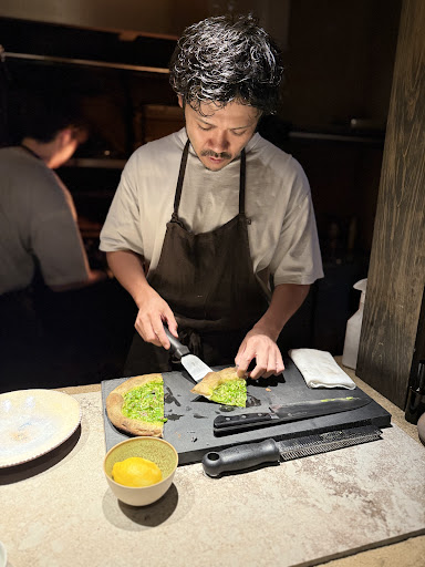 オープンキッチンから漏れるライブ感と、洞窟のように演出されたレストラン空間。器やインテリア、アメニティにまでこだわりが感じられ、まるで異世界に足を踏み入れたかのような浸りを得られました。