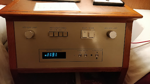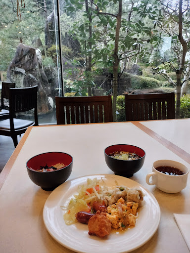 The lobby has a money exchange machine, amenities (toothbrush, razor, tea bags, hairbrush, etc.) luggage weighing scale ( 荷物用はかり ) and wonderful staff that offer great bilingual service in Japanese / English. The room was booked by an airline due to unseen delays, so it was a short notice. I stayed in a twin room that came equipped with everything: a mini fridge, water kettle, towels, free wifi, a tv and mugs for tea. The room cleanliness though was very questionable. You can tell the room is rundown from the scuffs on the toilet and the rust in the overhead above the sink. It is an old hotel I suppose. The body towel I got in my room had a dark stain in it (coffee maybe? 😬) and there were stains on the bed comforter. The beds only had one pillow. The mattress is firm but not hard. I had a comfortable sleep, but the cleanliness was an issue for me personally (I am a germaphobe). Pajama top was provided and it was clean. The breakfast service was extremely great. It is buffet-style with a wide variety: tuna + yellowtail sashimi, ramen station, Chinese food, karaage chicken, coffee / tea machine, miso soup, and more. There was a small dessert station with pudding. There was also a mackerel / squid grilling table but I didn't get to try. There was a great window view of the garden outside with a koi pond. The breakfast service really made up for the whole hotel experience. I would definitely come back for the breakfast and free shuttle service, but because of the room cleanliness I may try other places. By the way, the room is much bigger than your standard Japanese hotel room, so for the price it is good value. I would recommend for families that do not pay mind to cleanliness much. They do not provide complimentary water, but there is water in the breakfast restaurant.