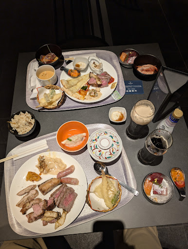 食事:伊藤グループよりは確実に↑(そうで無いとねぇ~^^;) 。しかし、同じ内容で温かい物は温かく。冷たい物は冷たく提供出来れば、イーブンかも。後述する持参品に本山葵のチューブタイプをセットすれば、総ての料理が価格相応になる気がします。飲料は此方の方が↑、種類で勝ってます。黒ビールも有りましたが、ワイン類はヌルい^^;。