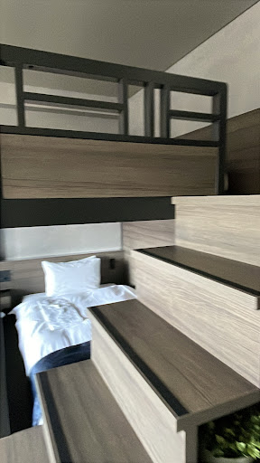 We thoroughly enjoyed our room. Layout had a kitchenette when you first walk in and a separate room for a bidet toilet, separate room for shower/bath and sink. 2 Lofted style bunk beds and two beds on the bottom. Beds were so comfortable. Cleaning occurs every 3 days but we were able to manage fine. Size of the room was huge for Japan standards. Kitchenette had utensils, pots, induction oven and microwave (fresh sponge to wash your dishes) and your standard electric water heater...great for bringing back items from the combini.