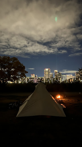 Read more連休最終日にバイクでフリーサイトを利用しました。受付は親切丁寧です。都心の真ん中の大きな公園なのでちょっと面白い空間。 連休最終日ということもあり、ガラガラ。広々として気持ちよかった。 設営場所までバイクで乗り入れて荷物を下ろした後、駐車場に移動。テントの近くには駐車できません。 17時から朝9時まで駐車場が閉まってしまうので要注意。早朝の出発や夜の買い出しができない。これが今回大失敗。 トイレは仮設トイレが3つ。 うち2つは鍵の暗証番号を使ってキャンプ利用者のみ使用可能になっていますか、あくまでも仮設。 炊事、洗い場など無し。防災用に渡されたたポリタンクの水を利用するシステム? トイレ横に仮設っぽい水道があるが飲めません。公園なので昼はランニングしている人やトランペットの練習をしている人、犬の散歩している人など憩いの場所になっています。 遊歩道には犬の糞があり、要注意。 幸い今回は芝生にはなかったですが、マナーの悪い飼い主がいたら大惨事になる可能性あり。無料貸し出し自転車が2台だけありますが、経験したことないほどお尻が痛い自転車。お風呂までは歩くと少し遠いと判断し仕方なく自転車を借りて天然温泉...