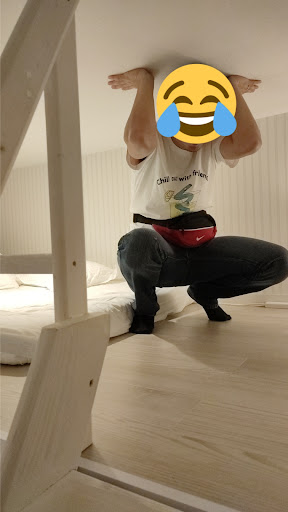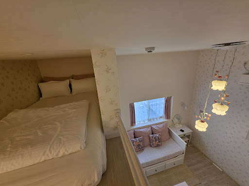 The Stay The room itself is exactly as advertised. As is standard, the rooms look bigger in photos than they really are, but that is to be expected. The room was big enough for the two of us and considering the bed loft, ceilings were pretty high making the room feel quite large even if floor space was limited. The room is equipped with all the basic amenities that you could expect: A bathroom with a sitting tub + shower, hairdryer, mini-fridge, kettle, Television, Couch, Side table and coffee table (ground floor), and a wide mattress on the loft suitable for two.