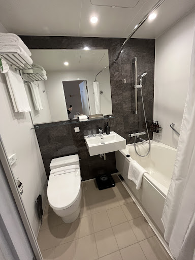 The bathroom is compact but perfectly functional, featuring both a shower and a bathtub, which has been particularly helpful for bathing our little one. The shower has excellent water pressure and precise temperature control. While we havenโt used it much, the in-room TV is a good size.