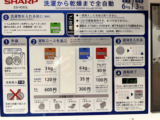 Laundry room onsite with maybe 3-4 washer/dryer combo machines. These seem to be always in use so you'll have to go at random times early in the morning or late at night if you want to do laundry. Be prepared to spend at least 1-2 hours doing it though because the dryers in Japan take a long time to actually dry your clothes.