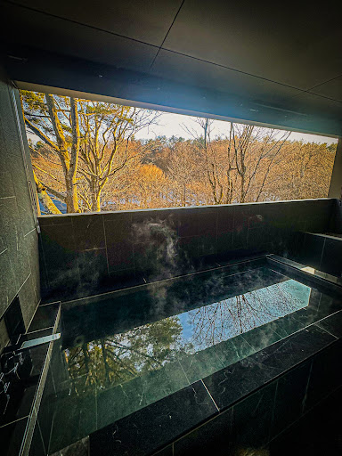 客室には専用の風呂があり、窓越しに景色を楽しみながらゆったりとした時間を過ごせます。館内にスパ施設はありませんが、その分、プライベートな空間での滞在を大切にできるつくりになっています。