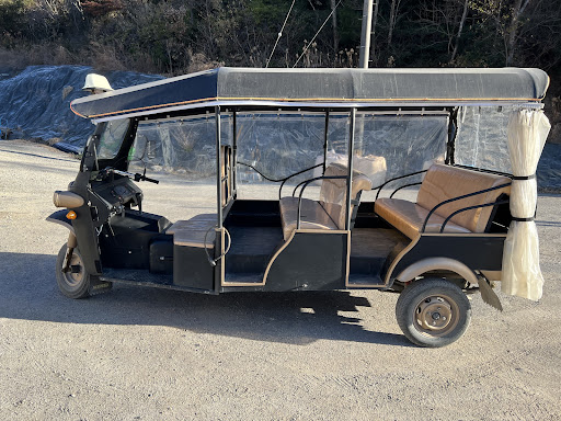 駐車場から施設はほぼ見えません。 トゥクトゥク?的な乗り物でスタッフの方が迎えに来てくださり、駐車場と施設を往復してくれます。