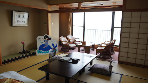 Read moreThe hotel management operate a shuttle service that picks you up from the station Kashikojima on the Kintetsu line at certain times.The drive to the hotel takes about twenty minutes.||||The hotel building itself looks a bit weathered from the outside but the rooms and public areas are well-maintained. Its location right at the seaside makes for a good view from your room, which is a spacious tatami room with a seating area and a small balcony. There is no private bath, because you can use the o-furo, but a sink with cold and hot water is in the room.||The public bath is beautifully made of wood and the mens' bath on the fifth floor on the top of the building also has an open-air bath from which you can watch the Pacific and the stars.||The food is tasty and artistically arranged. Dinner consists of lots of different courses. Breakfast is also a treat and throughout typical Japanese. The only concession to western tastes was the coffee jelly as part of...