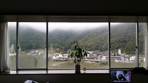 Perched on the hill overlooking the rive this is a contemporary style hotel that looks quite western. However beds are Japanese style futons on Takashimi mats.|Staff was very friendly greeting us and provided a proper indoor bike storage in the main reception area. The rooms are lovely and huge by Japanese standards and overlook the river valley, with a small outside balcony.|There is also washing machine dryer available near reception and an in-house Onsen. Whilst seemingly no-where near a convenience store there are vending machines including one dispensing beer hidden on the second floor.|Unfortunately breakfast was very Japanese and whilst presented very nicely I'm afraid I didn't appreciate the selection, including having to grill your own fish (bait size) on your personal griller.|A nice hotel apart from the fact I was suffering from Japanese breakfast overload by this...