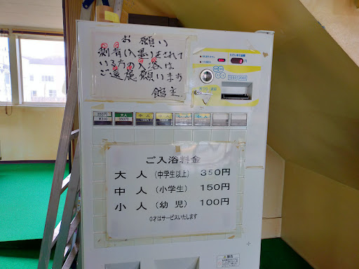 風呂場への通路は、何か古い迷宮に入ってゆく感じで、不安が募る。その風呂場は、一階の一番奥まったところにありました。 恐る恐る浴場に入ると・・・ とても明るくて、広い。 迷宮から抜け出たような解放感があり、とても、いい。そしてその先には、露天が。 露天の湯船は三つ。真ん中のが、コーヒー色をしています。常連さんが 冷泉 だと言っていました。確かに、ぬるい。しかし夏場は、大人気だそうです。左右のは、ごく普通の温度でした。 内湯は露天に面したものがあって、入場すると、これが真っ先に目に入ります。しかしよく見ると、手前の奥の方にも湯船が・・・ 入ります。実は、こちらが圧巻でした。 何と言っても泉質が良い。ツルリ、ヌルリとした感じで、たちまち肌がすべすべになるではありませんか。アルカリ分が濃いのでしょう。そして、実によく温まります。ただ、床は、成分のせいでとても滑りやすい(初めての方は、転ばぬようご注意を)。飲泉もできるようで、古びたカップが味を出していました。 なお、こちらにも湯船が三つ、それぞれ湯温が違います。どれも古いらしいが、どの湯船にも趣がある。そして、(源泉)掛け流しのようでした。