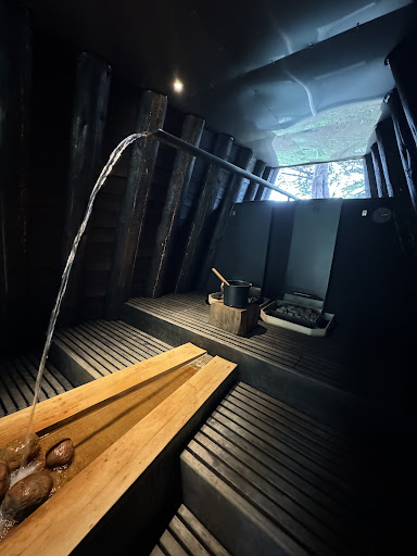 空のバケツとラドルがあり、そこにシャワーで水を溜めて中に入る。 サウナ室外の設定自体は100度になっているが、3段目でもマイルドな室温。 ストーブはWストーブで、座面の奥にある。 ストーンが積まれているのは3段目の座面と同じ高さ。 天井は高いが、ロウリュすると背中からしっかり熱が伝わってくる。 サウナ室も、サウナ施設全体もガラス窓のため、洗練されたサウナ施設と、外に広がる自然と空を眺めることができる。 BGMはサウナ室内に降り注ぐ源泉の流水音。