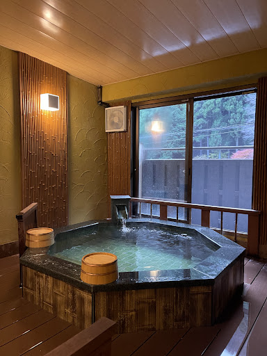 Read moreOur Japanese colleague who lives in Shizuoka recommended that we all stay at this ryokan, as he liked both the variety of onsen and the caring reception he received when he called to make inquiries. This ryokan is quite remote, but its location is historically and culturally important as Umegashima is the origin of Japan's first cultivated crops of wasabi. How cool is that! We were assured that fresh, local wasabi would be part of the (mostly) traditional dinner served that evening.||||Yunoshimakan is a beautiful building, and privacy is of great importance. There is a limited amount of rooms, and the four onsen are private, so reservations in one-hour increments are made for each party. The attendant was so very polite, pleasant, and caring. We were very fortunate that our friend was Japanese, because little-to-no English was spoken or written on the rooms or menus or onsen instructions (but I'm sure we could have muddled along just fine). There was a family with a young child, and several young couples as well as an older couple.||||We were served an incredible multi-course meal, and ground our fresh wasabi on a shark-skin wooden grater. The wasabi frothed up in a soft foam, and tasted fresh, complex, and hot but not sharp or bitter like the wasabi normally served at your local kaiten sushi place. It was incredible with the sashimi course, and we used the wasabi through-out our meal (which included oden, which later became the base for the ramen course, a yakitori selection, a salmon/potato/cheese gratin, rice ball course, miso soup, fruit and gelatin dessert ... There was more but you get the idea this was a 2-hour minimum experience). My husband and our friend even had fresh wasabi in their shochu, but I opted for the citrus wine instead. ||||There were 4 onsen, 3 of which were the wooden type you'd expect, but the 4th was the most unusual, a man-made rock cave outside of the building called "yama" onsen. It was so unique and interesting! It was fairly small, rock-based, and only fitting a maximum of 2 people, and the water was much shallower. It was a bit claustrophobic for me, so luckily another onsen was available, the "rin" onsen (tree) with the wooden tubs. We also got to try a different onsen for the morning bath, so that was very neat.||||We had an incredible experience, and I would highly recommend this place. We would definitely stay here again! ||||The only thing that made me sad was that their little store was out of their packaged tea canisters, which had a line drawing of the hotel on it, so I couldn't purchase some for myself and for omiyage gifts. I also did not know that I could have kept the bath towel imprinted with their logo but that is minor compared to the wonderful experience and memories we have of...