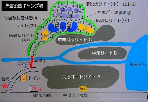 下に降りた河川敷の部分はオートキャンプエリア。入ロの看板には特に書いていませんが、村役場のHP写真でも幕を張ってますから多分大丈夫。