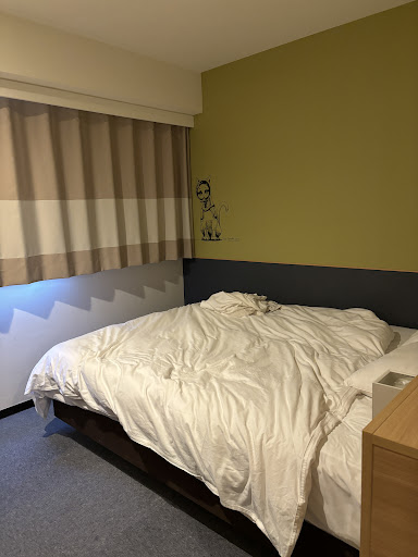 Room is of decent size for one person, there's space for luggage on the floor and you can still walk without tiptoeing. On the outside, it may look traditional and monotonous but inside it's very clean and new with cute design in room (my room's color thene is green and warm yellow with an adorable cat art on the wall) and at the lobby cafe. Smiling friendly staff and some can converse in English fine!