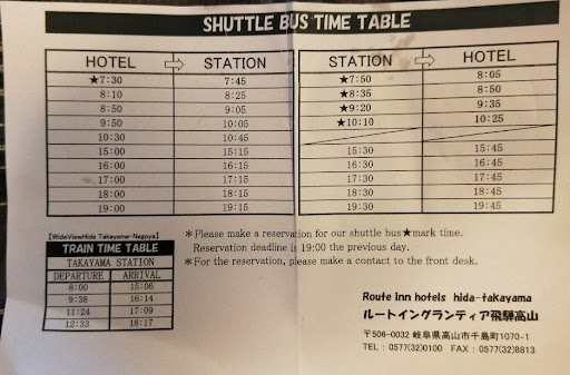 Our party of four had two rooms on the third floor facing over Takayama. Staff were always friendly and helpful. The rooms were comfortable with adequate storage etc. and were spacious. The beds were quite firm, but still a comfortable night's sleep. ||||The bathroom is quite small, which wasn't a particular problem. The very high step into the bathroom was the problem. Easy to fall down it, on a middle of the night bathroom visit. Some people with mobility problems might well struggle to get in and out of the bathroom.||||The hotel provides Japanese style pyjamas for visits to the onsite onsen. We used the onsen both nights we stayed at the hotel, and found it very relaxing experience. The water is not from a natural spring though.||||The hotel is a distance from town, so you would need to utilise the shuttle bus service. We found that this was very handy and had no problems fitting in with the schedule.||||We ate at the hotel for the first night after a late-ish arrival, and found the buffet dinner quite adequate, although food is not kept particularly hot. The buffet breakfasts were also enough to keep us going for the morning. ||||Overall, we had no problems with the hotel. It was the best place we could find...