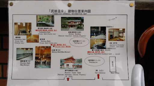 Takeo Onsen has a cluster of three onsen in close proximity, Saginoyu, Houraiyu and Motoyu. It also offers family baths like Karouyu and Hananoyu. The onsen is housed in the compounds of Shinkan Building and Romon Tower Gate which are designated as National Important Cultural Property. The baths are segregated, with Saginoyu offering indoor, outdoor and sauna baths water is alkaline and leaves a nice feeling on the skin. Lockers for shoes are provided. Shampoo, body soap, hair dryers and refundable ¥100 lockers are available in the changing...