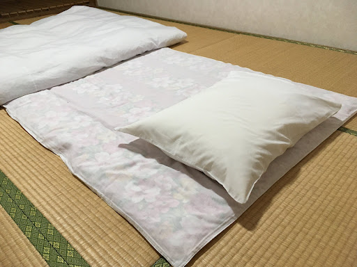 敷布団が極限まで薄い煎餅布団。寝ると尻の下に畳の硬さを感じる。畳は最近張り替えたみたいで新しい感じ。